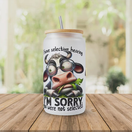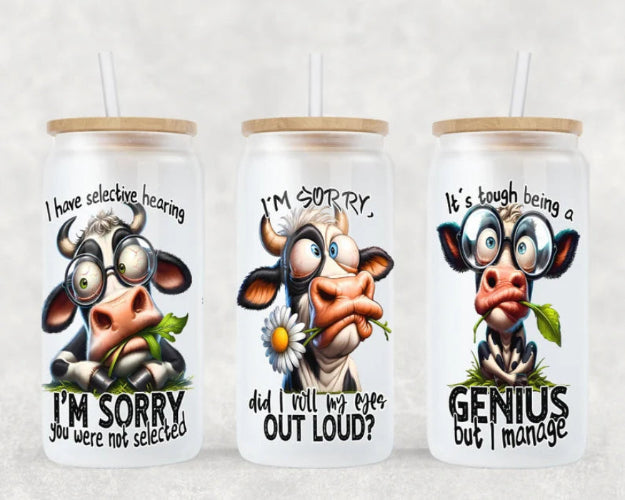 Meet our frosted glass cup with bamboo lid + straw – personalised just for you (yes, even with a sarcastic cow 🐮✨).